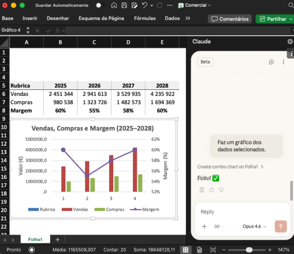 Abres o Excel, activas o add-in, e tens um chat lateral. Pedes para criar uma tabela dinâmica, corrigir fórmulas com erros, ou reorganizar dados, e o Claude faz as alterações directamente na folha, assinalando cada célula que alterou e explicando o resultado.